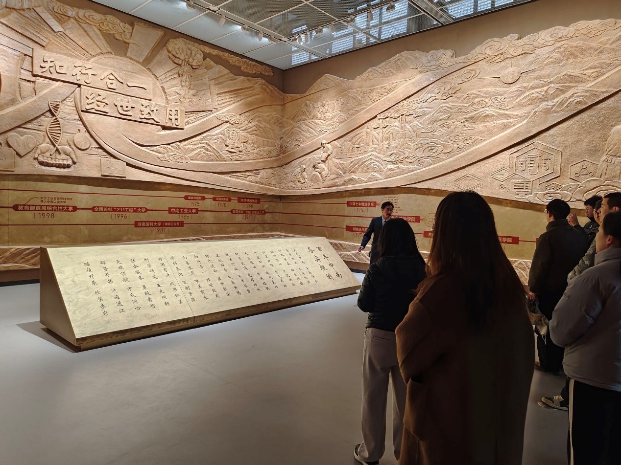 一进入校史馆,映入眼帘的是“知行合一,经世致用”的校训。在专业讲解员的引领下,首先来到介绍中南工业大学发展历程的第一单元。讲解员满怀自豪地提到,在短短1952 - 1959年这几年间,凭借雄厚的师资力量和严谨的治学态度,培养出了刘业翔、余永福等8名院士,为国家有色金属产业发展输送大量专业人才。接着步入展现湖南医科大学辉煌过往的第二单元。早在上世纪初,一批海外学成归来、满怀报国之志的医学先驱来到长沙,凭借自身精湛的医术和先进的理念,克服资金短缺、设备简陋、观念陈旧等诸多困难,建立起一套严谨、科学且极具前瞻性的医学教育体系。多年来,湘雅培养出大量优秀医学人才,“南湘雅,北协和” 的美名传遍大江南北,在中国医学发展历程中留下了浓墨重彩的一笔。离开湘雅板块,来到呈现长沙铁道学院峥嵘岁月的第三单元。长沙铁道学院自成立以来,始终与国家铁道事业发展紧密相连。从荒无人烟的山岭间进行铁路勘测设计,到面对复杂技术难题时的攻坚克难;从培养一批又一批专业扎实、吃苦耐劳的铁道技术人才,为我国铁路交通事业的蓬勃发展立下汗马功劳。