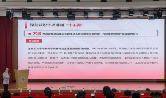 随后,赵晓霞书记领学《新时代高校教师职业行为十项准则》,从对“十项准则”的提出背景、如何全面理解把握准则内容、十项准则”的具体内容、“十不得”及其纪法解读与警示案例四个方面对其展开了全面的解读和分享。赵晓霞书记通过其他高校教师的违法违纪警示案例,提醒全体教职工要从反面典型案例中汲取教训,引以为戒,时刻做到自重自省自警。