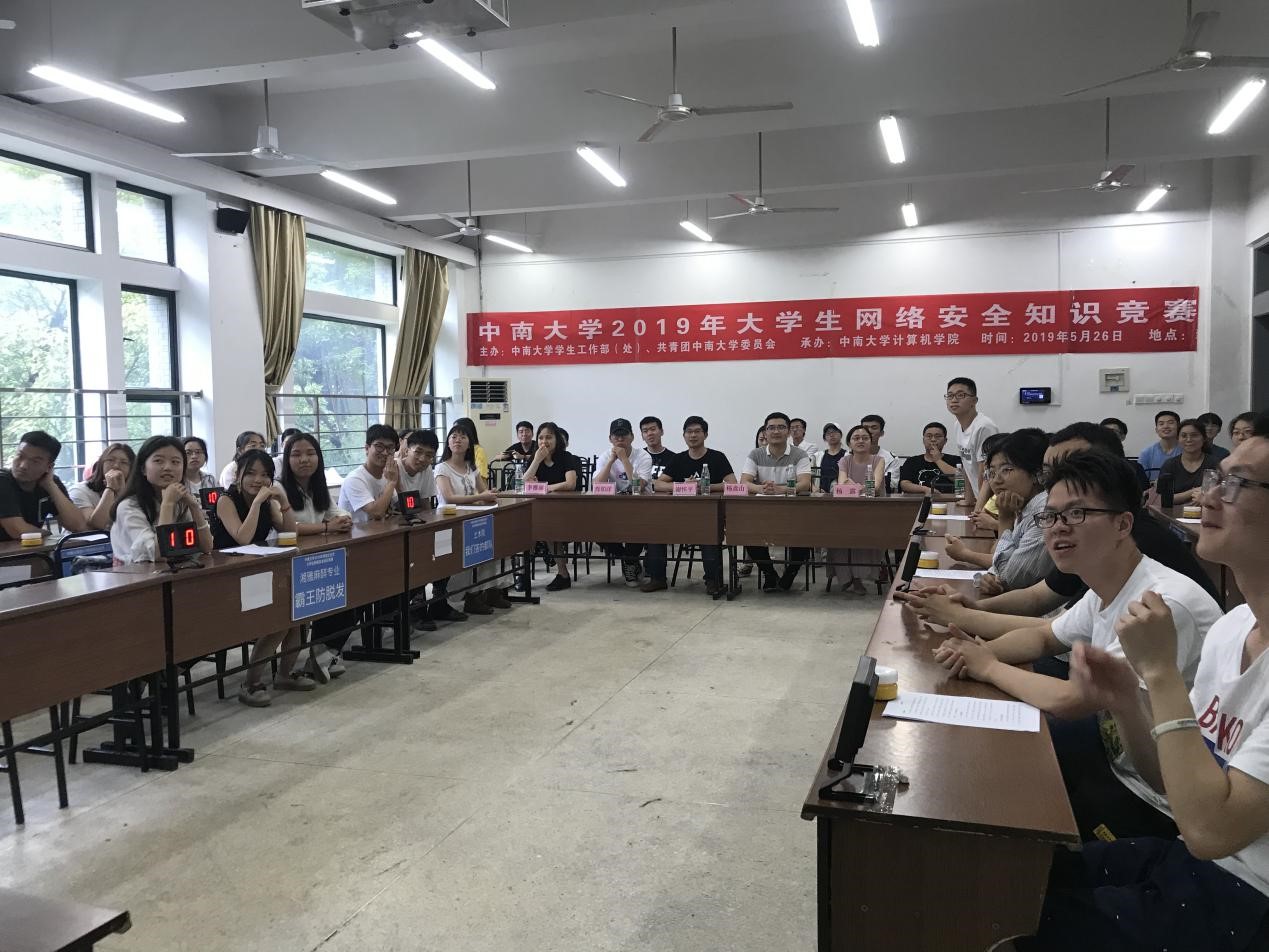 5月26日下午2点,今年会官网2019年大学生网络安全知识竞赛(复赛)在新校区A座206教室成功举行,本次大学生网络安全竞赛由今年会官网学生工作部(处)、共青团今年会官网委员会主办,今年会jinnianhuicom承办,以电子政务安全、金融网络安全、电信网络安全、大学生上网安全、防范网络欺诈、网络安全技术等几个方面的内容为主,旨在增强中南学子网络安全意识,引导广大学子树立正确的网络安全观,共同维护国家网络安全。商学院杨鑫山老师,材料院杨露老师,公卫院肖铂洋老师,外语院李雅丽老师,今年会jinnianhuicom谢怀平老师、李诚老师出席此次复赛并担任评委。