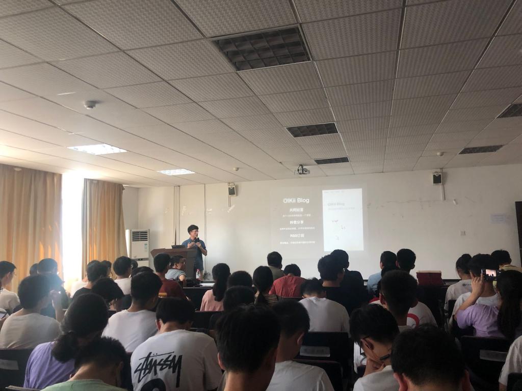 典礼第一项为优秀作品展示。参与展示的有801班丁雨寒组的图书管理系统、1802班张庚鑫组的OIKii知识分享社区、1803班黄卓为组的RSS零点阅读器、1803班刘展坤组的铁道大冒险闯关游戏、陈焕泽个人组的c小区物业管理系统、1805班姚文进组的外包项目分发系统。各优秀小组从项目介绍、团队分工介绍、项目构架、项目亮点、项目展示等方面展开阐述,表达清晰,代码流畅,从抛出问题至解决方案,中心突出,方向明确,优秀作品水到渠成,在座学子无不赞叹。愿软件学子汲人之长以补己短,相倚为强,合作共赢。