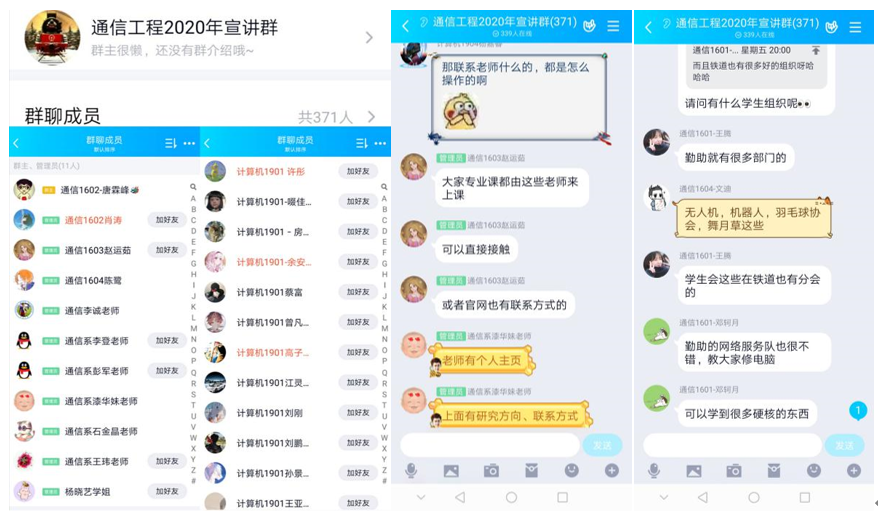 在本次沙龙前,系支部书记石金晶、雷文太副主任还专门建立了“2020通信工程宣讲”qq群,邀请19级同学进群互动,与群里的老师,16-18级在校学长学姐以及毕业后优秀的学长学姐密切交流,从通信工程专业认识,专业特色,培养方案,课程设置等,到铁道生活方方面面的介绍,再到毕业去向,就业情况等,通信师生都悉心为19级同学答疑解惑,指点迷津,qq 群用户已近400人,师生们畅所欲言,互动密切,通信师生的热情感染了19级同学们,也让他们深刻体会到了通信大家庭的温暖。