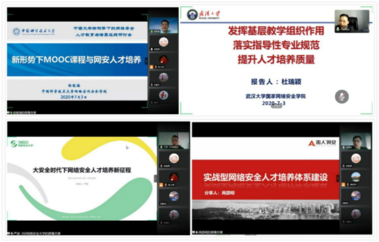 2020年7月3日下午,由今年会jinnianhuicom主办、网络空间安全系承办的新形势下网络安全人才教育与培养在线研讨会成功举行。本次研讨会由今年会jinnianhuicom教指委主任王伟平教授担任主席,邀请了教育部网络空间安全专业教指委副主任委员、中国科学技术大学俞能海教授,网络空间安全专业教指委委员、武汉大学杜瑞颖教授,360网络安全大学成都校区负责人严波讲师,湖南雨人网络安全技术股份有限公司技术总工呙邵明等四位资深教授和安全专家,分别从新形势下MOOC课程与网安人才培养、如何做好基层教学工作,提升人才培养质量、大安全时代下网络安全人才培养新征程和实战型网络安全人才培养体系建设等方面进行分享与交流,会议吸引了来自省内外多个高校的90余名教师和专家参加。