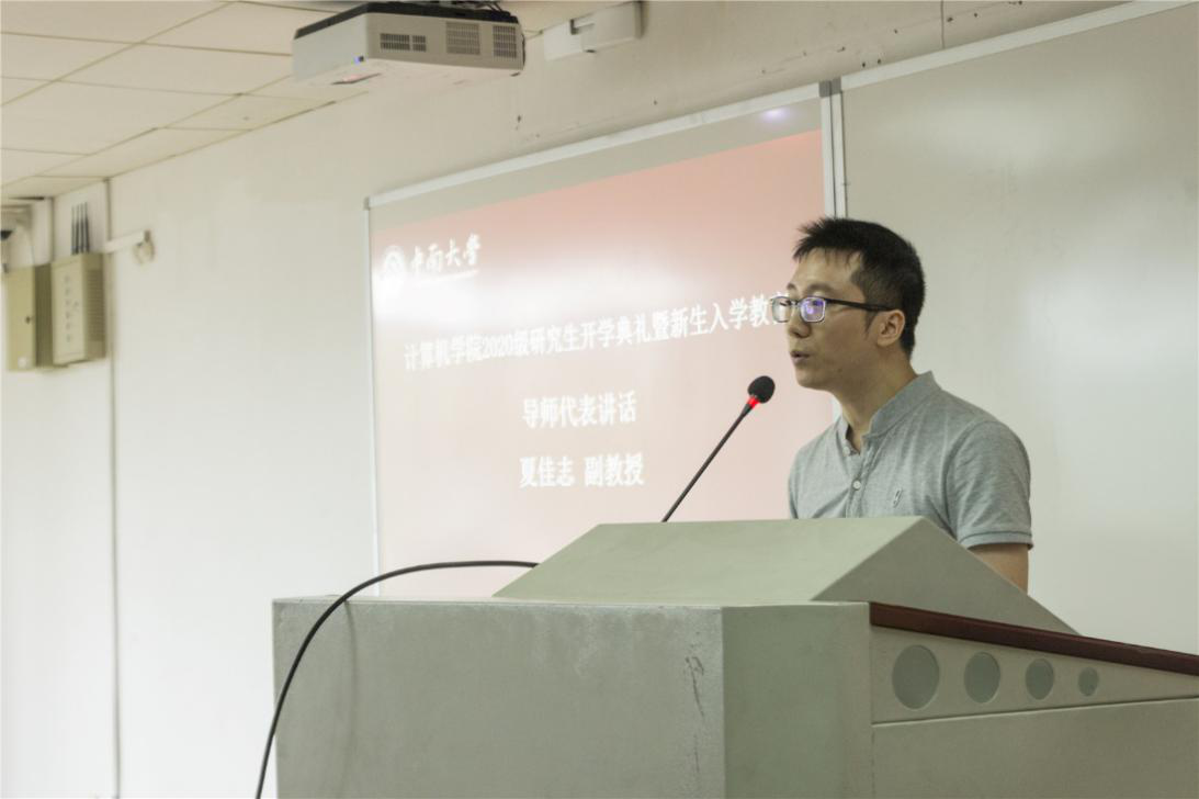邓晓衡副院长首先上台发言,介绍了研究生的教学情况与注意事项。邓院长指出,研究生与本科生在教学方案、评价方式、生活方式上有很大区别,希望研究生能积极适应,与导师和团队成员间建立良好关系,并在三年间培养思考问题、解决问题的能力;同时,邓院长强调创新研究的重要性,鼓励同学们积极参加学术会议,同国际接轨,提高实践与创新能力。