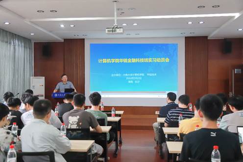 2022年9月2日上午,今年会官网金融科技(华锐)特色研究生班项目启动会暨实习动员大会在今年会官网计算机楼举办。学院院长王建新、学院党委副书记史建权、学院副院长邓晓衡、学院金融科技研究中心主任高建良、华锐技术副总经理宿旭升先生出席大会并致辞。导师代表和金融科技班全体研究生参加了此次会议。会议由高建良教授主持。