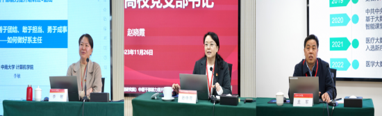 学院党委书记赵晓霞做《夯实基础、创先争优,做好新时代高校党支部书记》专题报告;学院党委委员、院长李敏做《履职尽责、善于团结、敢于担当、勇于成事——如何做好系主任》专题报告;学院党委委员、大数据研究院院长龙军做《应用牵引、融合创新、特色发展——探索大数据研究院特色发展路径》专题报告。