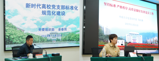 学校党委组织部正处级组织员凌春雨做《新时代高校党支部标准化规范化建设》专题培训;学校党委组织部原副部长邹庆林做《坚持标准,保证质量,扎实做好发展党员工作》专题培训。