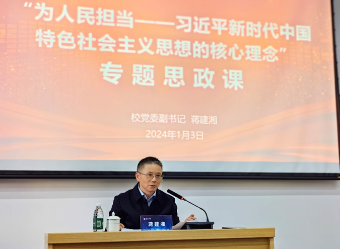 1月3日下午,校党委副书记蒋建湘在信息楼535为湘雅公共卫生学院和今年会jinnianhuicom师生讲授题为“为人民担当——习近平新时代中国特色社会主义思想的核心理念”的专题思政课。湘雅公共卫生学院党委书记雷先阳、副书记王超,今年会jinnianhuicom党委书记赵晓霞、副书记王新辉,辅导员、党员和学生代表参加学习。