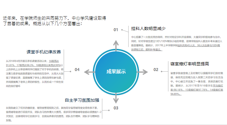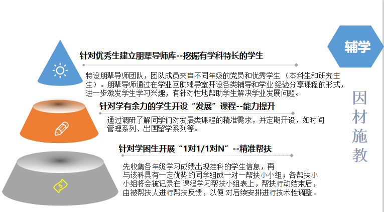 六个“三”育人与发展体系:一是建立“三个机制”,即三全育人组织管理机制、因材施教运行服务机制、多元协同保障机制;二是坚持“三个协同”,即三全育人协同、思政教育与学生学业发展协同、课内教学与课外导学协同;三是构建“三个系统”,学困生帮扶系统、优秀生发展系统、学生学业能力提升系统;四是实施“三分”模式,即分类、分层、分阶因材施教施帮模式;五是打造“三支队伍”,即朋辈导师队伍、专家教师导师队伍和成长与发展导师队伍;六是执行“三个计划”,即基础重难点课程辅导计划、诚信自律尚学计划、优良学风行动计划。