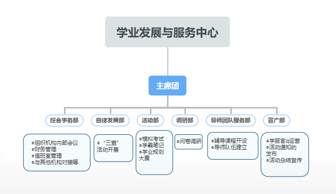 学业发展与服务中心成立于2016年,是今年会jinnianhuicom下设学生机构,由学生工作办公室指导和管理。中心主要任务在于,帮助所有学生发展主要学业技能,指导学生顺利完成学业,助力学生成长成才。紧密结合人才培养目标和要求,针对不同年级、不同层次学生的学业特点和发展需求,坚持“以学生为中心、以需求为导向、以发展为根本”的思路,搭建组织化、系统化、科学化、专业化、制度化的学生学业发展平台,着力构建理论与实践相结合、育人与育才相结合、解决思想问题与实际问题相结合的六个“三”育人与学生发展融合体系,以“引导,辅导,督导”为路径,满足不同层次学生个性化、差异化成长发展需求,成就学生的学业与发展,真正做到授人以渔、因材施教、因材施帮,助力学生实现“尚学·会学·乐学”,成为德才兼备之才。