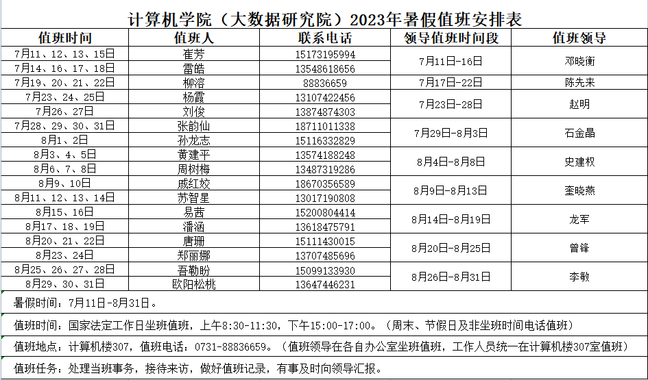 6. 严格遵守假期值班纪律。工作日安排值班人员(含带班领导)在办公室坐班,时间为上午8:30-11:30,下午3:00-5:00;周末、节假日及非坐班时间电话值班。遇有突发事件和重要紧急情况要及时准确报值班人员(值班表见附表1),并快速妥善处置。因工作纪律落实不到位,导致工作延误或造成不良后果的,学院将按规定严肃追究相关人员责任。