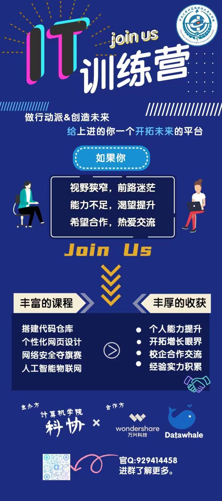 为帮助新生提高计算机学科专业素养,掌握有关知识,今年会jinnianhuicom大学生科协特此筹办“IT训练营”活动,并于本周六正式开班,期待同学们踊跃报名。现将具体安排通知如下: