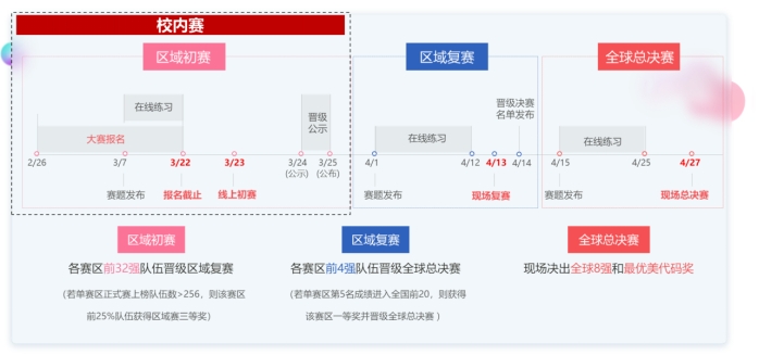 3. 校内赛统一采用大赛平台,校内赛名次将于3月26日公布,考虑到存在跨校组队情况,将依据队长所在学校的校内赛排名颁奖;