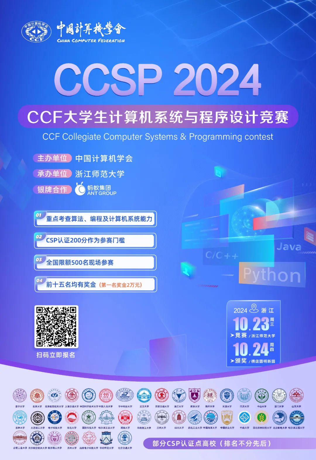 2024 CCF CCSP竞赛将于2024年10月23~24日在浙江金华举办。其中,第一天为比赛日,届时将有来自全国各地近500位计算机专业优秀学子同台竞技;第二天下午举办竞赛颁奖典礼,CCF将为获奖选手进行现场颁奖。凡是参加现场竞赛的选手均可免费参加于10月24~26日在横店举办的CNCC2024大会。此外,CCF将在CNCC2024同期的10月25日颁奖晚宴上向获得本次竞赛前十名选手和前十名高校颁奖。