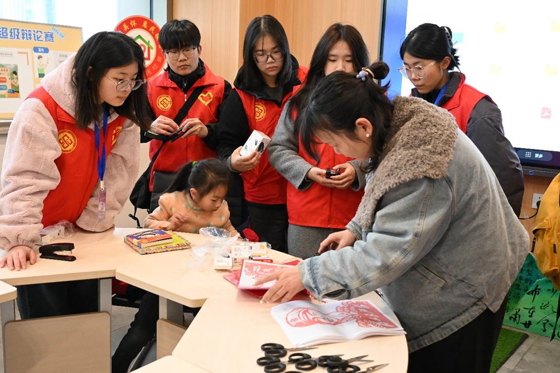 随后,李子童画机构负责人老师向小朋友们介绍了剪纸艺术的深厚底蕴与独特魅力,并对即将开展的剪纸转印活动进行了详细演示。在老师的详细指导与有序组织下,志愿者们将手工工具分发至每一位小朋友,并一对一地与小朋友开始剪纸手工之旅。