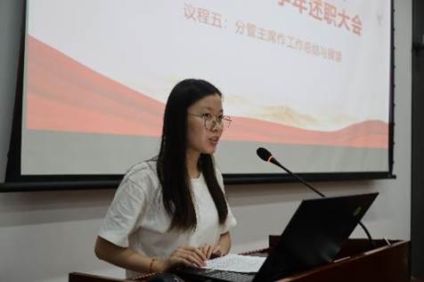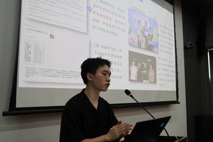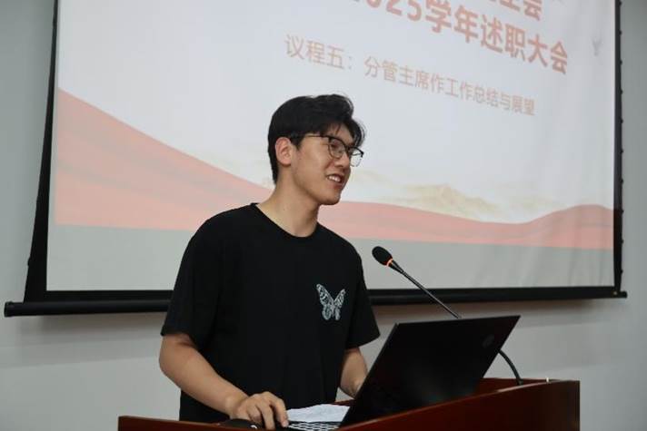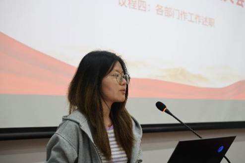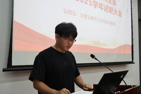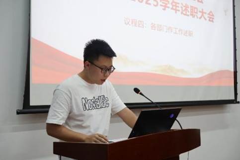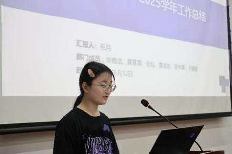 随后,各部门依次作学期工作总结汇报。学术部重点介绍了学术讲座品牌化建设和就业指导精准化服务成效;文体部以阳光型研会建设为主线,系统梳理了趣味运动会等12项特色活动开展情况;综事部围绕协同性研会建设,汇报了活动保障和制度建设成果;宣传部通过数据可视化,展示了新媒体矩阵建设成效;学生权益部聚焦研小通、权小信、益小达三条权益主线,重点汇报了节日主题活动开展及学生诉求调研及解决情况。