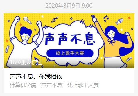 2020年的寒假十分特殊,在抗疫这个没有硝烟的战场上,无数英雄坚守岗位散发光和热,成为人民的勇士和国家的斗士,学子们也积极配合防疫举措,居家线上学习。为了丰富同学们的课余生活,体现“隔离疫情,不隔离爱”的主旨,今年会jinnianhuicom学生会面向全体学子开展了“声声不息”线上歌手大赛,通过“全民K歌”平台进行演唱和投票。