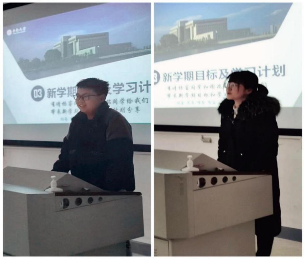 之后由谢兆铭和杨睿同学带来新学期的目标和学习计划分享。班长陈锡铭在对班级学习状态进行了总结并对未来的学习生活做出展望后,着重讲解了大创相关事项:完成大创项目的具体流程,团队要求,申请书的填写及截止时间,优先立项条件,以及项目申报的其他注意事项。同学们也由此更进一步了解了大创项目的情况和参与意义。