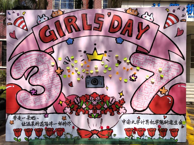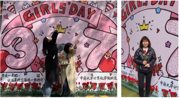 本次女生节活动在校本部、新校区、铁道校区同步举行,每个校区的院楼前都立有精美的女生节展板,每一位女教师、女研究生都可以来这里领取鲜花、写下留言、拍照纪念。