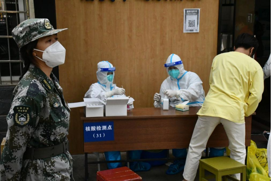 有了前五次核酸检测的实践经验,本次核酸检测在速度和效率上有了更大的进步。自觉逐渐成为了核酸检测的主旋律,不扩音器每层楼每层楼地提醒,队伍也比前几次更加规整。相隔两个地板砖安静排队的同学们,提前打开健康码,积极配合志愿者和医护人员的工作。提升的工作效率、合理的位置安排、恰当的工序分割,在本次核酸检测中体现得愈加明显。不到4点钟,全校核酸检测已经接近尾声。工作人员越来越熟练的检测流程,同学们越来越规范的排队行为等背后是每个中南人抗疫的决心。