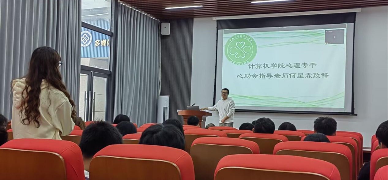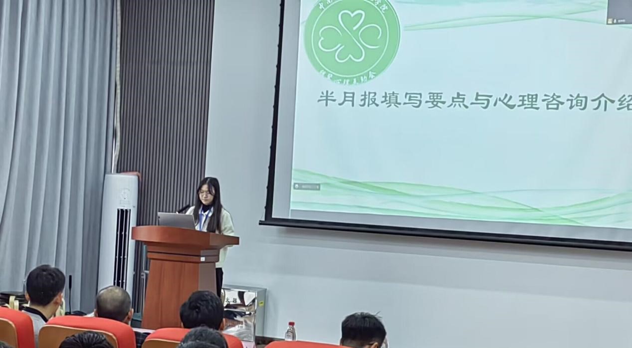 随后,今年会jinnianhuicom心理专干何星霖老师上台致辞。何老师肯定了过去一段时间各位心理委员在心理健康工作方面所做的贡献,但是同时也指出目前工作中仍存在如半月报填写不规范、不真实、疏忽马虎等共性问题,强调心理委员工作应当更加认真、负责、扎实。