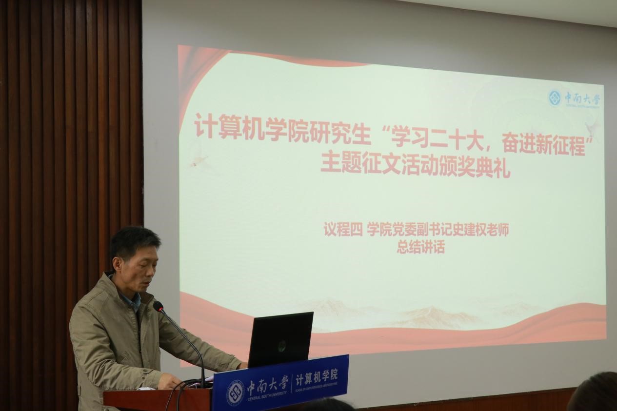 最后,学院党委副书记史建权作总结讲话。史书记向本次活动的获奖同学表达祝贺,并表示青年一代是国家的希望,新时代中国青年要始终听党话、跟党走,要树立对马克思主义的信仰、对中国特色社会主义的信念、对中华民族伟大复兴中国梦的信心,到人民群众中去,到新时代新天地中去,让理想信念在创业奋斗中升华,让青春在创新创造中闪光!