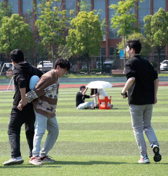 “啪—”操场上响起了几声短促的气球爆炸声音,原来是进行得如火如荼的运球接力赛。顾名思义,运送球类来回的接力赛,不过本次运动会运送的是轻盈可随风飘、庞大若爆的气球,这让接力赛顿生妙趣与难度。比赛共有12队选手,每队需要每两人背对背夹住气球在两点进行接力运球,不可手触碰球,掉落气球可以原地捡起并继续前进,共有两个来回的接力,先到者为胜利队伍。比赛只有一轮,12个队伍两两对决,决出的6队都会获得10分,此外按照到达时间排出第一、二、三名,在总分再分别加上30、25、20分。