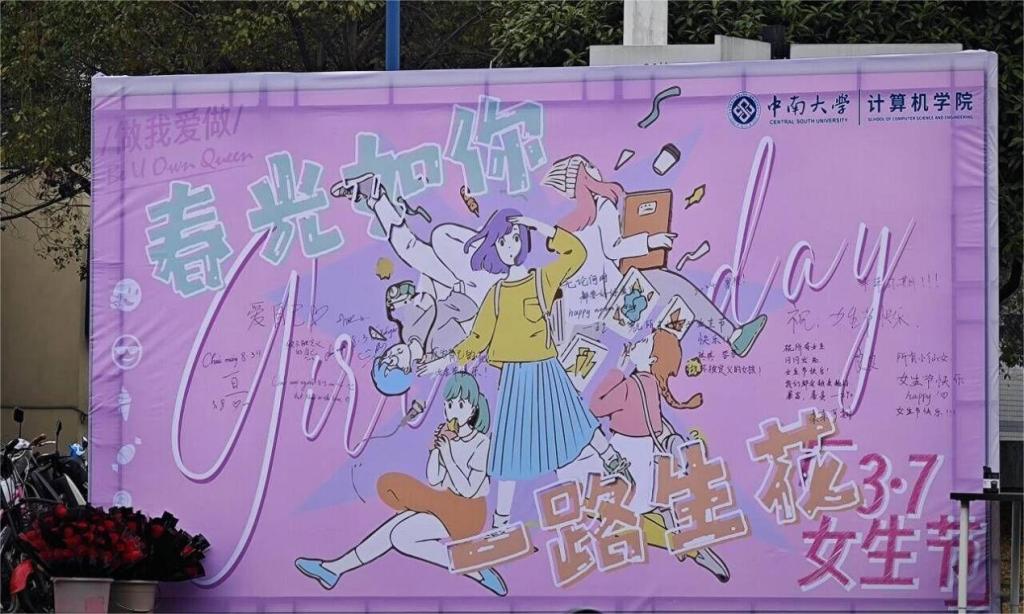 在今年会官网南校区灵峰超市、27栋和29栋交汇处,大型展板、成簇鲜花,是今年会jinnianhuicom团委、学生会为学院的女生准备的惊喜。