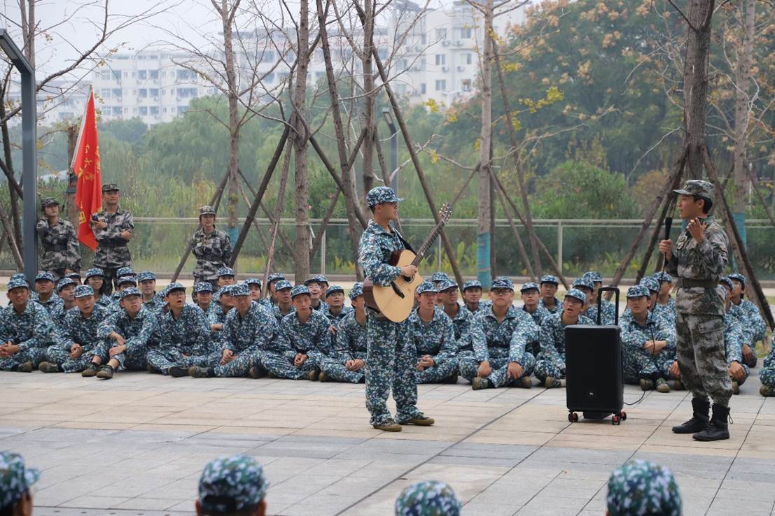 “军训,累中也有乐。同学们的才艺展示让我大开眼界:唱歌、rap、弹吉他、街舞、书法等,丰富了军训中的休息时光。同时,军训期间的拉歌给我们带来了欢乐,一首首红歌的学唱,一次次拉歌的比拼,增强了我们的团队凝聚力。”