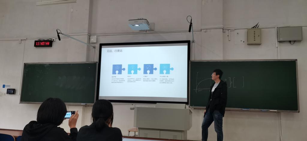 10点55分,朋辈导师薛俊皓上台开讲。薛俊皓导师从市场需求的角度出发,选取前端软件工程师、后端开发工程师、算法工程师、测试工程师、产品经理等IT行业典型岗位,分析了IT行业目前对人才的典型需求和薪资状况,帮助同学了解了不同岗位对知识和技术的要求和IT行业技术的发展状况,让同学们清醒地认识到自己的不足。薛俊皓导师还提出各类优质竞赛对同学们学习能力和专业素养的提升大有益处,作为充满朝气的大一新生,应积极主动参与和自身发展方向吻合的竞赛活动,充分拓展课外知识,提高实践能力。最后,薛俊皓导师强调熟练掌握编程语言,精通算法,保持极强的学习能力是今年会jinnianhuicom同学们的安身之本,并提醒同学们在专业之外也要广泛涉猎,关心时事,保持健康,在大学实现全面发展。