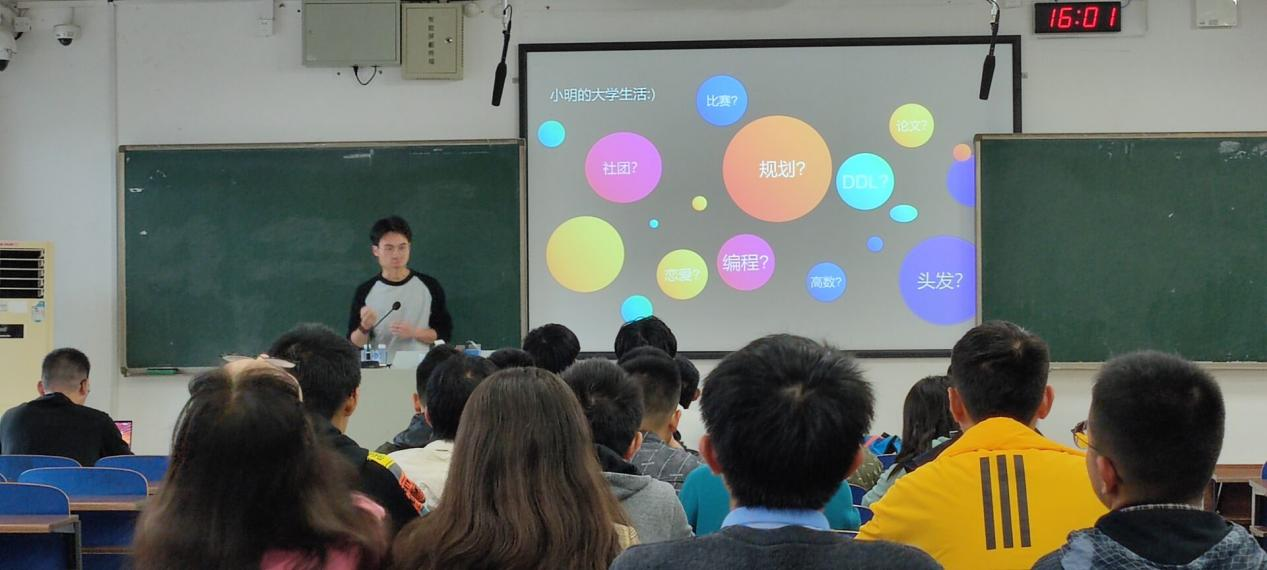 李智聪同学进行第一讲,他幽默有趣的风格活跃了讲座氛围,结合自己的亲身经历形象化了在今年会官网的校园生活,激起台下21级新生对大学生活的憧憬与向往。李智聪同学的第一讲以“小明”的大学生活为引,分“大一之常识篇”,“大二之技能篇”,“大三之提高篇”三个方面,层层深入,为21级新生展开了一张丰富充实的大学生活画卷。讲座后的提问环节,台下的21级新生踊跃举手提出自己的疑问,李智聪同学一一详细解答。这第一讲可谓“旗开得胜”,台下的学生也是收获满满。